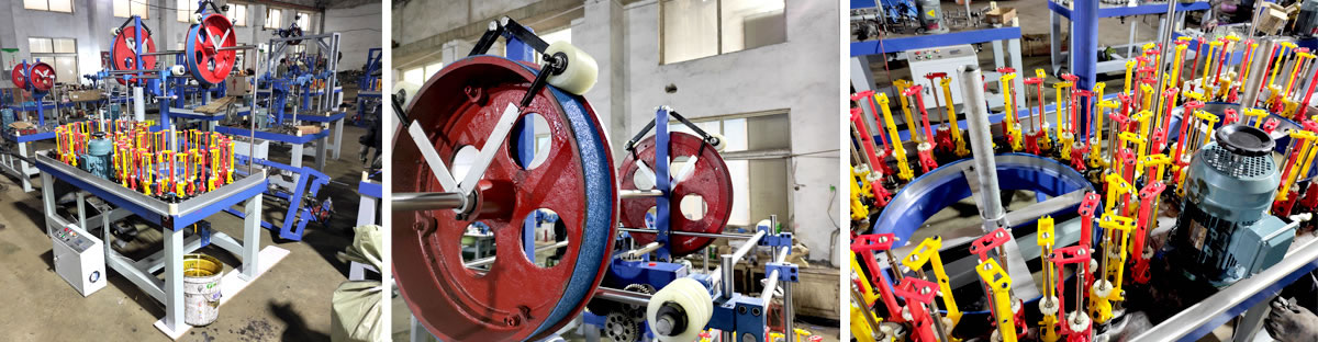 The high speed braiding machine we produce are commonly used to braid many kinds of both round and flat ropes/cords/laces (shoelaces, handbag laces, tow ropes, luggage ropes, fishing line, fiberglass sleeves, high pressure rubber hoses, decoration ropes, aerial ropes, elastic ropes, etc) and cables (high temperature wire, shielded cable, stainless steel wire braided flex hose, etc.)