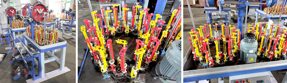 The high speed braiding machine we produce are commonly used to braid many kinds of both round and flat ropes/cords/laces (shoelaces, handbag laces, tow ropes, luggage ropes, fishing line, fiberglass sleeves, high pressure rubber hoses, decoration ropes, aerial ropes, elastic ropes, etc) and cables (high temperature wire, shielded cable, stainless steel wire braided flex hose, etc.)